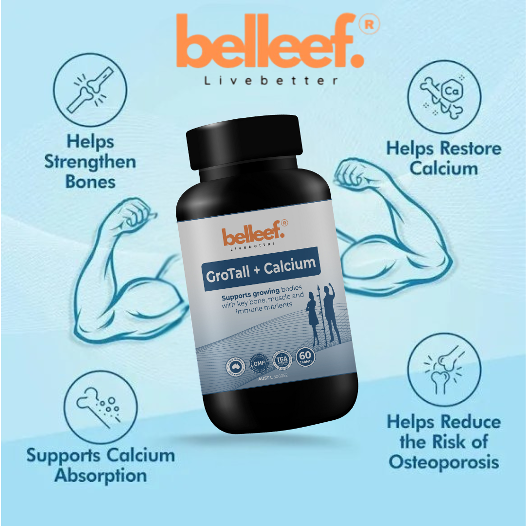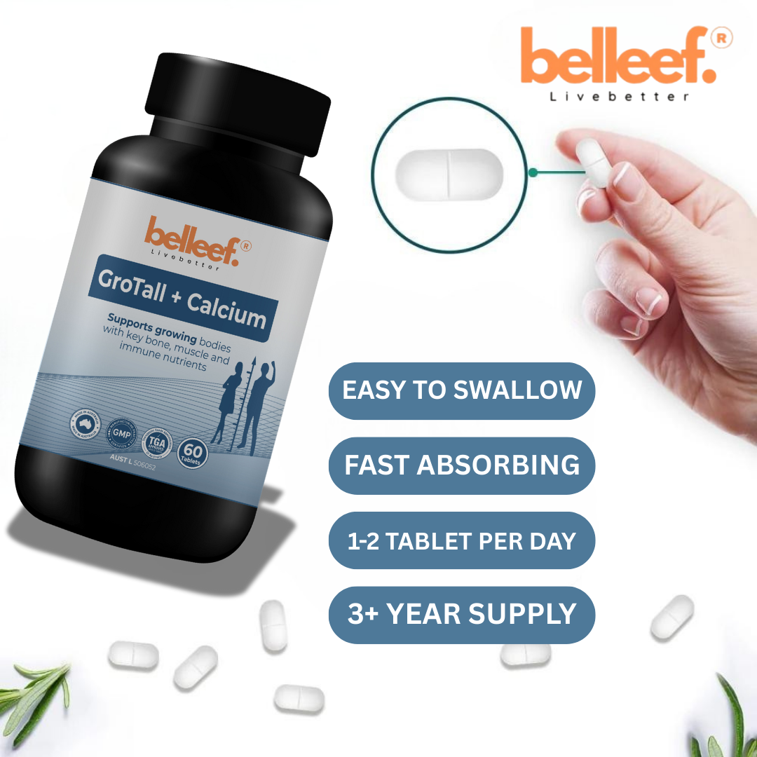 Nutrient Nature GroTall + Calcium is a comprehensive formula designed to support healthy growth and development in children. Each tablet delivers key nutrients including lysine, calcium, magnesium, and hydrolysed collagen, along with vitamins D3 and K2 to promote bone strength, healthy teeth, and musculoskeletal function. Lysine is an essential amino acid that plays a role in normal growth, while vitamin D3 aids calcium absorption and supports bone mineralisation. Vitamin K2 further contributes to bone health by assisting calcium utilisation. Calcium and magnesium help maintain healthy bone and muscle function, and magnesium supports neuromuscular activity. This product also supports immune system health and general wellbeing.